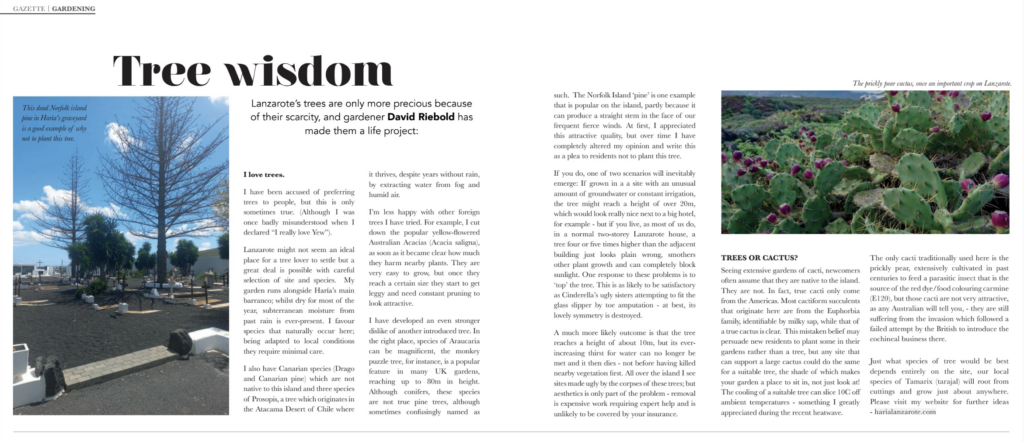 I love trees. I have been accused of preferring trees to people, but this is only sometimes true. (Although I was once badly misunderstood when I declared “I really love Yew”). Lanzarote might not seem an ideal place for a tree lover to settle but a great deal is possible with careful selection of site and species. My garden runs alongside Haría’s main barranco; whilst dry for most of the year, subterranean moisture from past rain is ever-present. I favour species that naturally occur here; being adapted to local conditions they require minimal care. I also have Canarian species Drago and Canarian pine which are not native to this island and three species of Prosopis, a tree which originates in the Atacama Desert of Chile where it thrives, despite years without rain, by extracting water from fog and humid air. I’m less happy with other foreign trees I have tried. For example, I cut down the popular yellow-flowered Australian Acacias (Acacia saligna), as soon as it became clear how much they harm nearby plants. They are very easy to grow, but once they reach a certain size they start to get leggy and need constant pruning to look attractive.