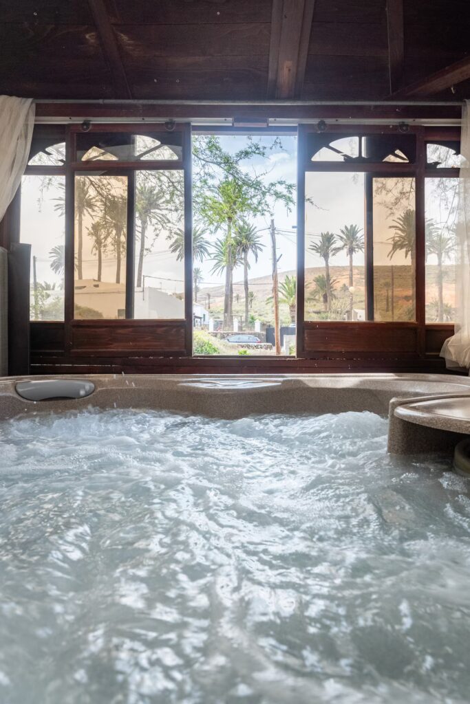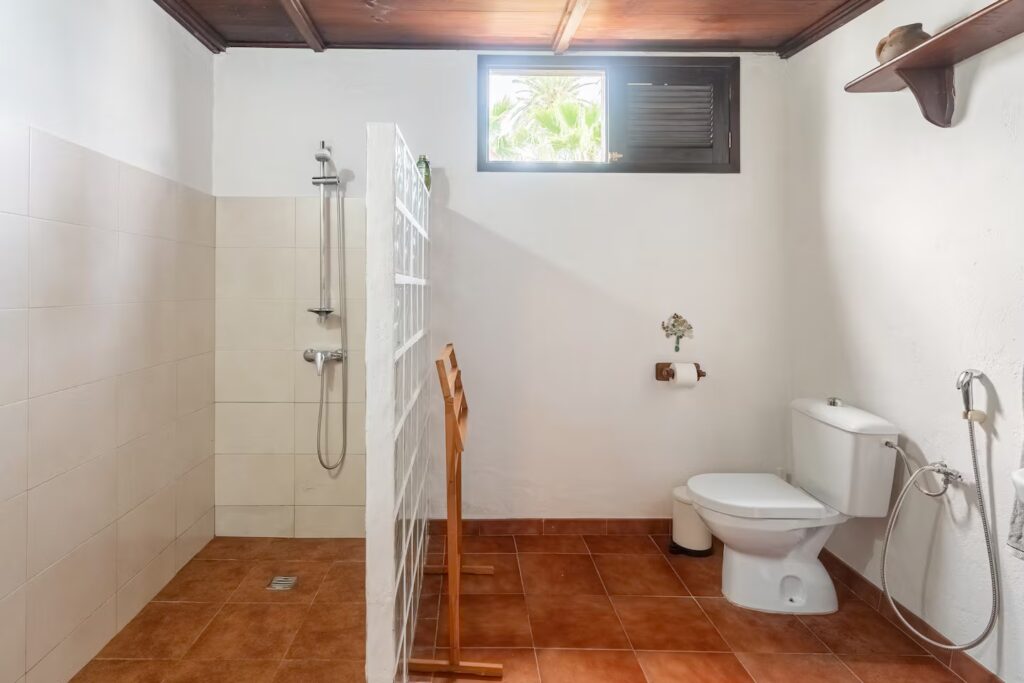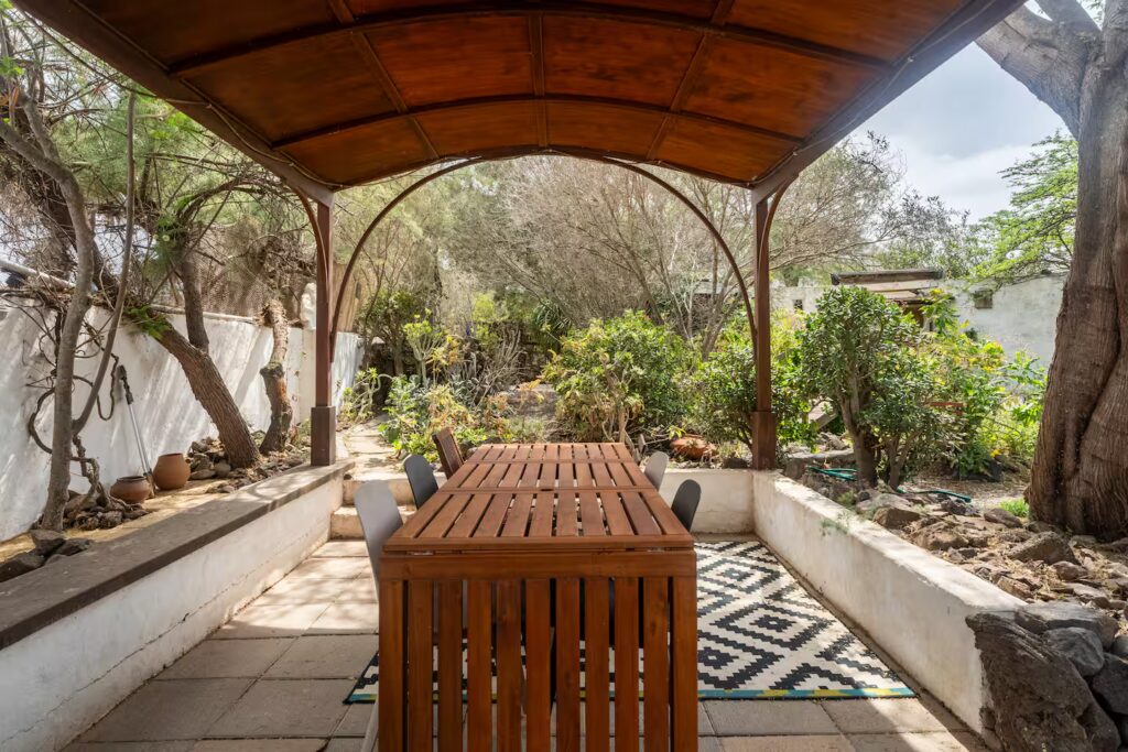 The garden is unique on Lanzarote, not least because of its many mature trees and great variety of local species of bushes and flowers – which of course attract a large number of fauna as well: frogs, lizards, hedgehogs as well as many different birds. It is an integral part of the living space and has been designed to provide guests with a variety of areas, ranging from covered and uncovered living areas suitable for lounging or eating al fresco, to secluded spots nestled in between the bushes and trees. Careful planning of paths, hedges and walls means that you will have plenty of privacy outdoors, even with a full house. The view from indoors, of the garden treetops and the mountains in the background, is even better from the patio in front of the apartment. It has a private as well as a shared entrance.