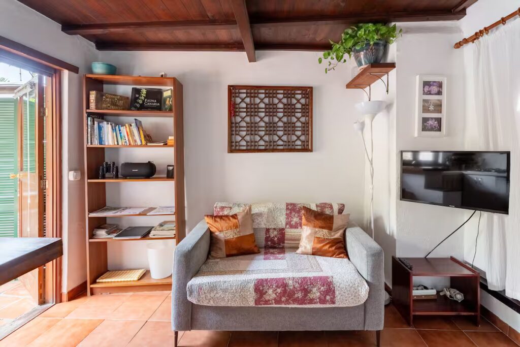 It consists of a downstairs living/dining room and a large upstairs bedroom with fine views of the village. It has a high peaked wooden ceiling, restored using the original, sturdy Canarian pine timber, cut with an adze rather than a saw.It opens onto a small roof terrace. The bathroom and kitchen are accessed via a small patio.