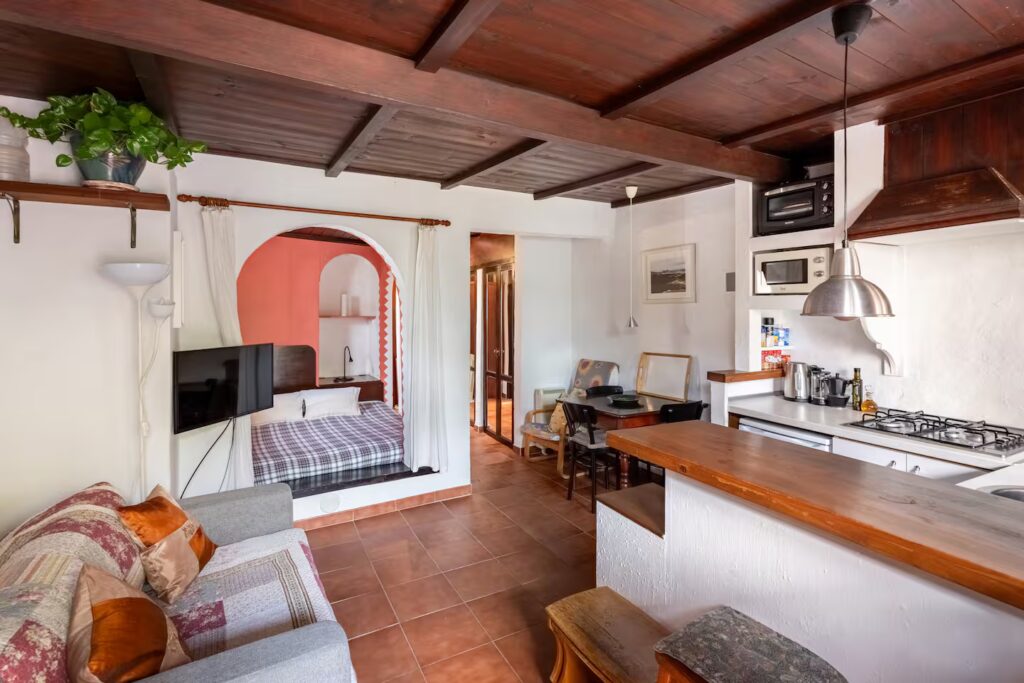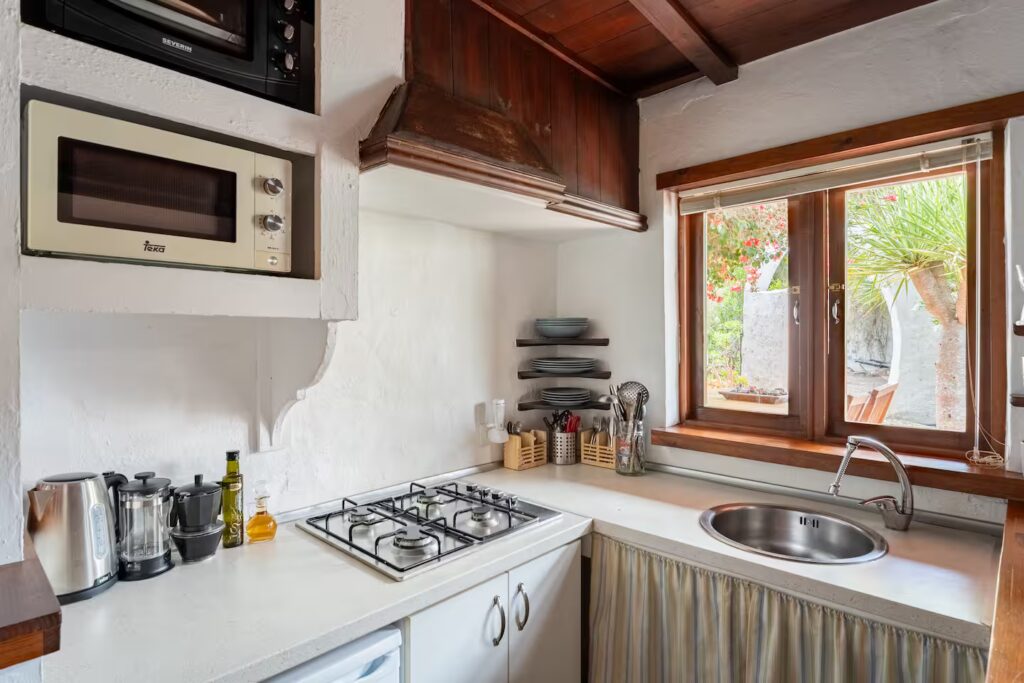 The garden apartment forms part of a recent construction on the barranco side of the old house. It is a studio apartment with a large, romantic sleeping space, a comfortable living/dining area with a single sofa bed, and a small but well-equipped kitchen. We have created a space we would like to stay in ourselves – which means that, although it may not be to everyone’s taste, it is comfortable, pleasant and well-equipped for any length of stay.